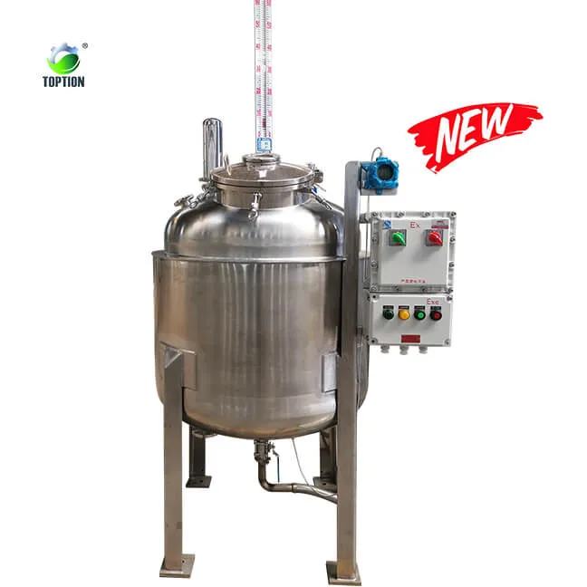 Spremnik za pohranu od nehrđajućeg čelika TOPTION podržava profesionalno prilagođavanje, dvoslojno, jednoslojno i prilagođavanje širokog raspona kapaciteta. Za prethodno smrzavanje alkohola prije centrifugalne ekstrakcije etanola, odaberite dvoslojni, odgovarajući hladnjak za postizanje učinka predsmrzavanja. Za skladištenje tekućine nakon filtracije odabire se jednoslojni spremnik koji se uglavnom koristi za puferiranje prije ulaska u isparivač kako bi se postigla svrha stabilnog i kontinuiranog punjenja.